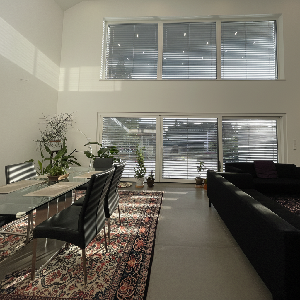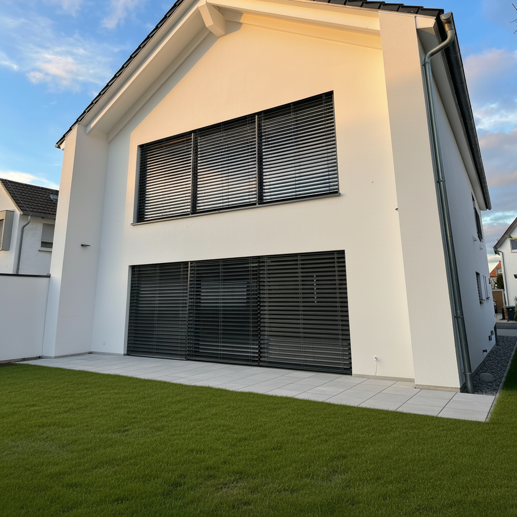 Die klare Formsprache, die elegante Putzfassade in Reinweiß, große Fensterflächen mit modernen Raffstores und die sauber gestalteten Außenflächen verleihen dem Haus eine ruhige, zeitlose und zugleich repräsentative Wirkung.